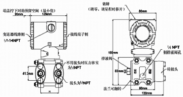 例:TDSB3051差壓變送器,量程0-300kpa,兩線制4~20 mA DC信號輸出,法蘭接頭、排氣/排液閥、隔離膜片均為316不銹鋼,智能表顯示器,管裝平支架,泄放閥在壓力室側(cè)面的上部,橢圓接頭內(nèi)螺紋NPT 1/2
